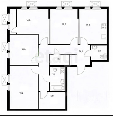 Площадь: 97.4 м2 (комнаты: 12.9-14.9-11.9-16.2-5.9м2)